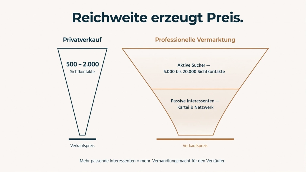 Der Unterschied zwischen Privatverkauf und professioneller Vermarktung liegt genau hier. Er entsteht in zwei Dimensionen, die oft vermischt werden.