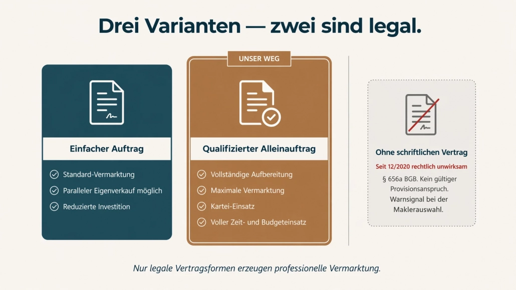 Im qualifizierten Alleinauftrag verkauft der Eigentümer seine Immobilie für einen definierten Zeitraum ausschließlich über einen Makler. Diese Vertragsform erlaubt uns, die volle Vermarktungsleistung (Fotografie, 360°-Touren, Portalgebühren, Kartei-Einsatz) vorzufinanzieren. Seit Ende 2020 schreibt § 656a BGB für Maklerverträge zu Einfamilienhäusern und Eigentumswohnungen die Textform vor — mündlich begründete Verträge sind unwirksam.