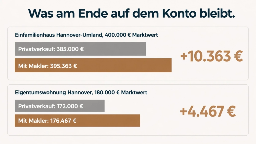 Beide Beispiele sind defensiv kalkuliert. Bei größerem Preisdruck oder mehreren Interessenten auf der Maklerseite fällt die Differenz häufig deutlich höher aus.