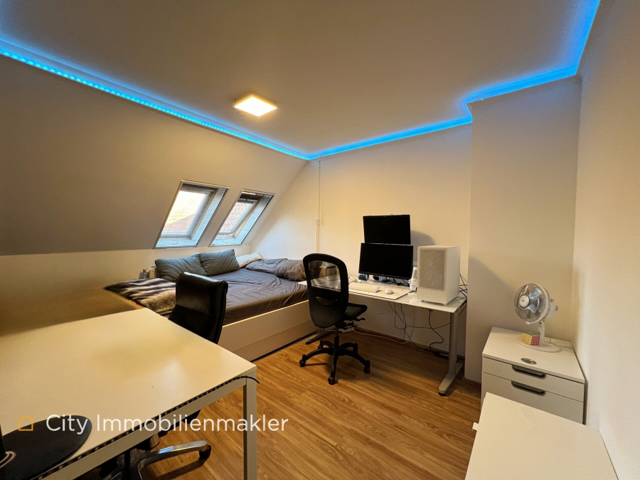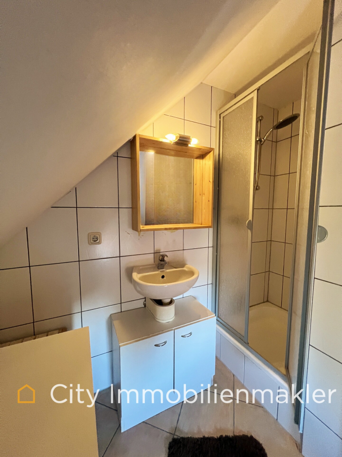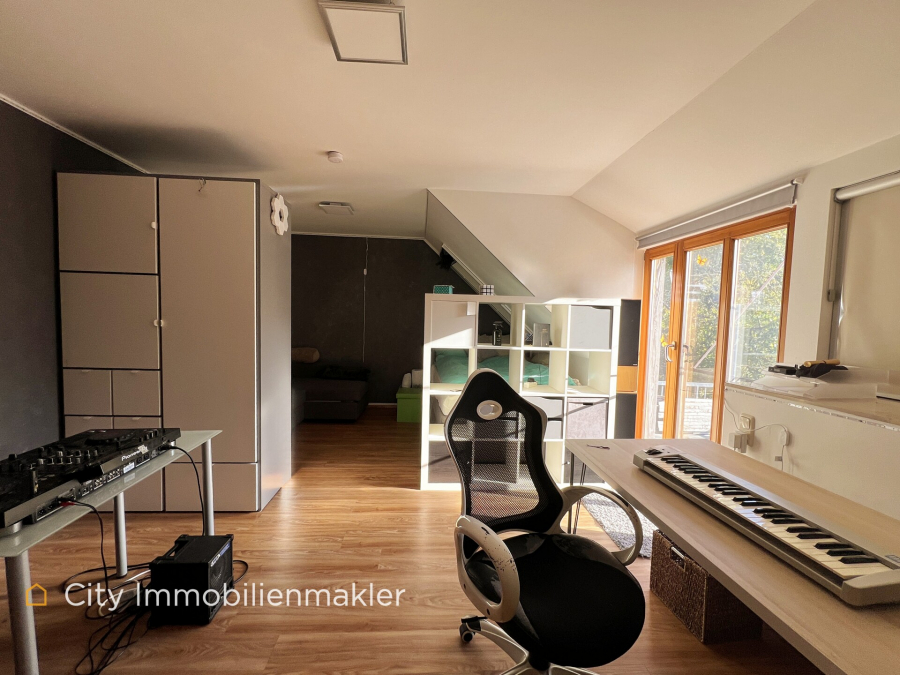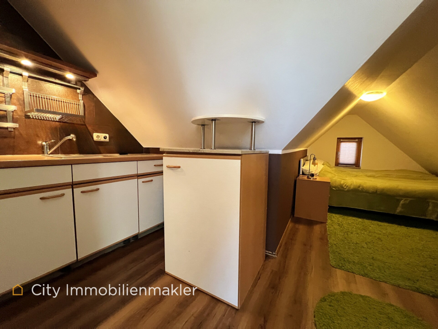 Das Dachgeschoss beherbergt eine gemütliche Einliegerwohnung mit ca. 23 m², einer eigenen Küche und einem Badezimmer mit Dusche. Diese Einheit eignet sich ideal für Gäste oder zur separaten Nutzung.