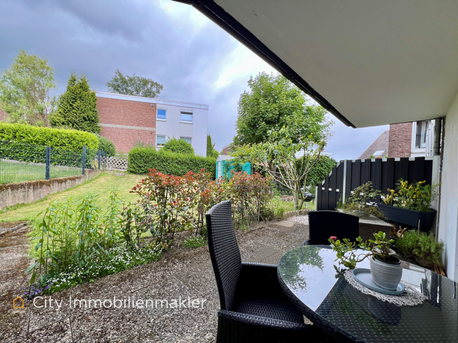 Die vermietete Erdgeschosswohnung verfügt über ca. 67 m² Wohnfläche, zwei Zimmer, eine separate Küche mit Einbauküche sowie ein Bad mit Wanne. Über das Wohnzimmer gelangt man direkt auf die Terrasse mit Zugang zum kleinen Garten – ein gefragtes Extra für Mieter. Die monatliche Nettokaltmiete beträgt derzeit 550 €, eine der beiden Garagen ist zusätzlich seit 2012 für 30 € monatlich vermietet.