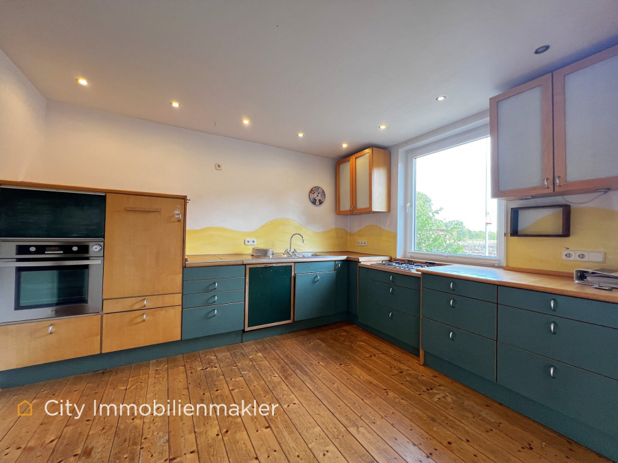 Die größere Wohneinheit umfasst rund 153 m² Wohnfläche, verteilt auf sechs Zimmer, darunter ein großzügiger Wohnbereich, eine geräumige Küche, ein modernes Tageslichtbad sowie ein flexibel nutzbares Zimmer mit separatem Eingang und Gäste-WC – perfekt als Büro, Praxis oder Gästebereich.