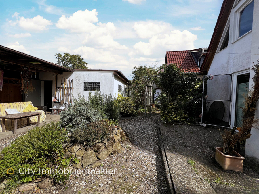 Das ca. 621 m² große Grundstück bietet viel Platz im Grünen – mit gepflegtem Garten, altem Obstbaumbestand, überdachter Terrasse und zwei Garagen. Das Haus ist voll unterkellert; neben Abstellflächen gibt es einen Hauswirtschaftsraum mit Gartenzugang.
