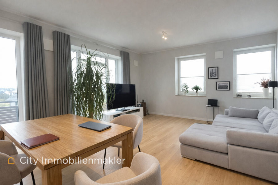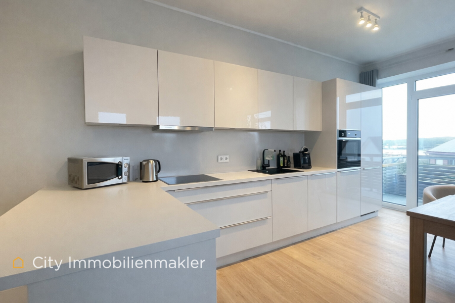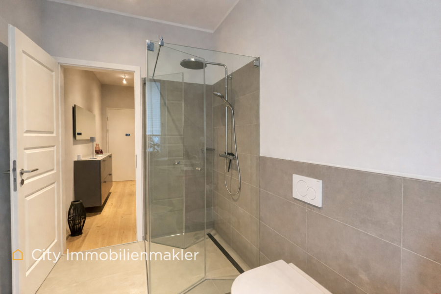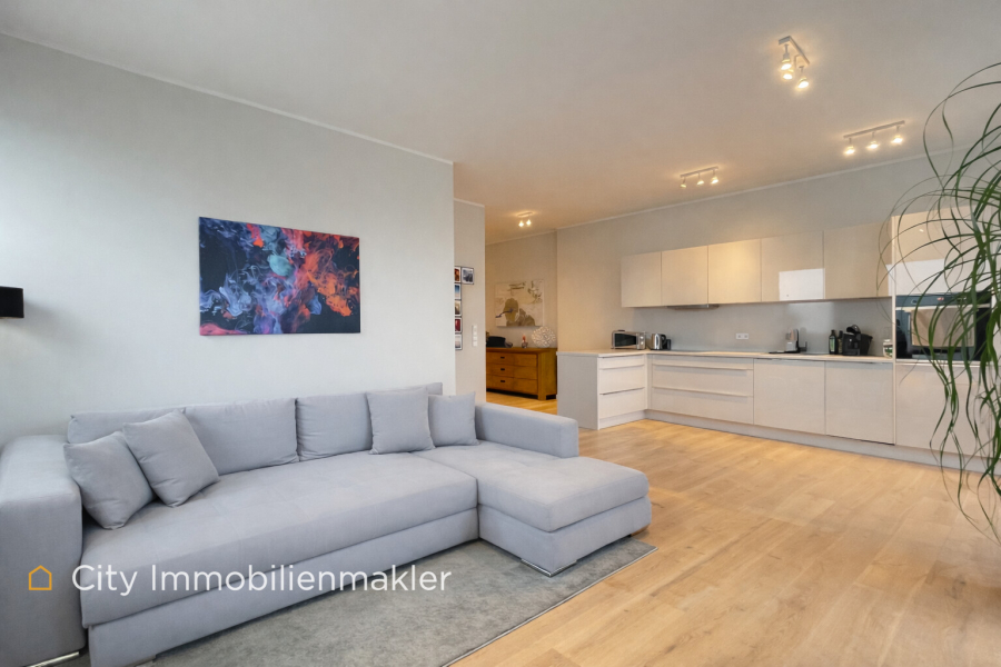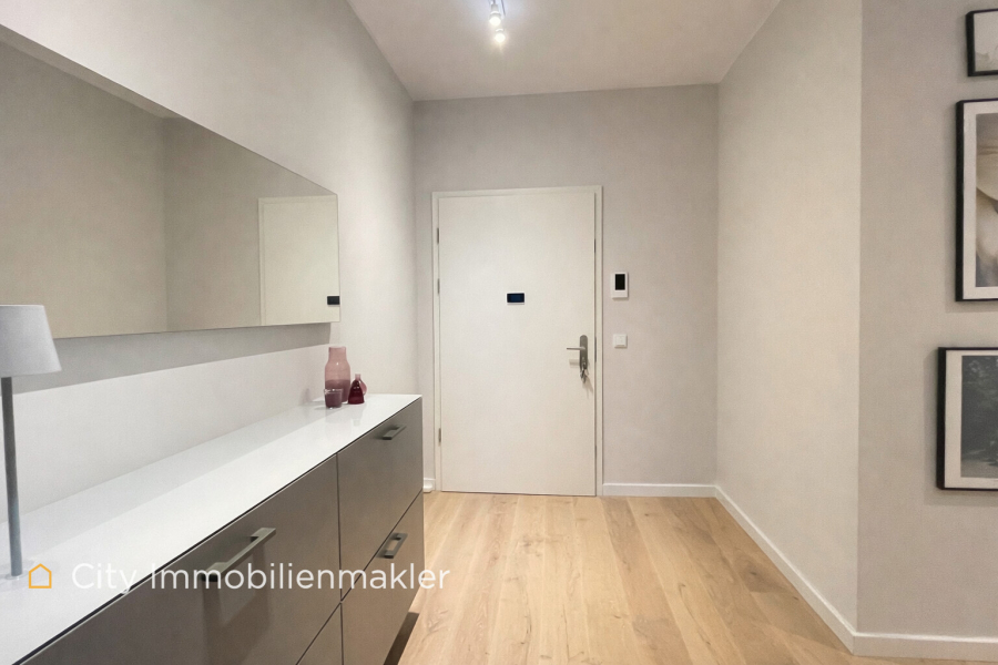 Der offene Wohn-, Ess- und Küchenbereich mit exklusiver Einbauküche schafft ein lichtdurchflutetes, modernes Wohnambiente. Das Schlafzimmer verfügt über ein Bad en Suite und Zugang zu einem der zwei Balkone. Ein weiteres Zimmer ist flexibel nutzbar. Hochwertiges Echtholzparkett, Fußbodenheizung, kontrollierte Wohnraumlüftung sowie zwei stilvolle Bäder unterstreichen den gehobenen Wohnkomfort.
