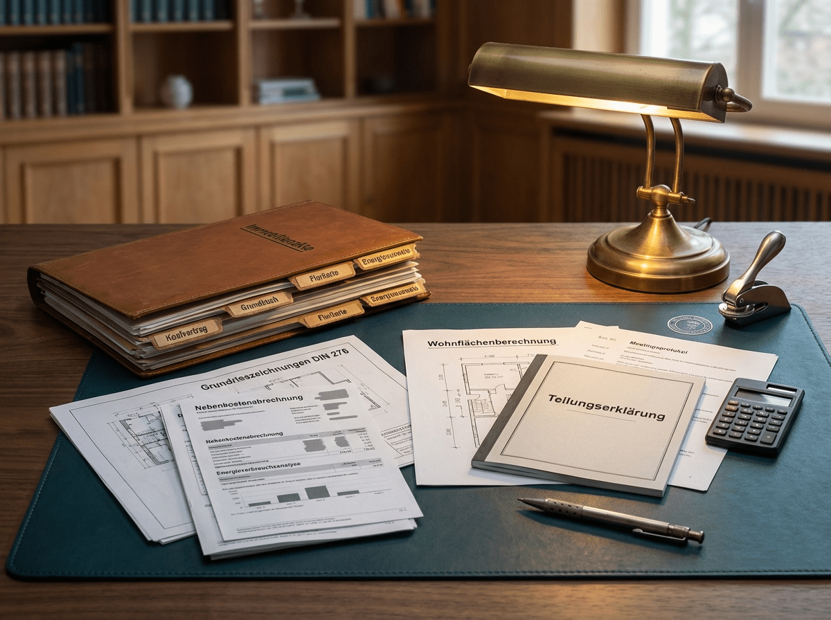 Mindestens: Grundbuchauszug, Energieausweis, Grundrisse mit Wohnflächenberechnung, Flurkarte und eine Baulastenauskunft. Bei Eigentumswohnungen kommen Teilungserklärung, Aufteilungspläne, WEG-Protokolle und Wirtschaftsplan hinzu. Zusätzlich empfehlen wir eine Sanierungshistorie – Banken fragen heute gezielt danach.